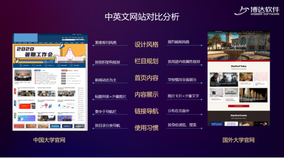 博达软件在项目开始之初,会与学校各个学科的老师成立项目专题小组,综合分析学校各学科国际化建设的优势亮点,并将学校特色融入到网站品牌建设规划中,同时借鉴众多世界一流名校案例寻找异同点,从细节入手,从全局规划能够体现高校特色的国际化网站建设方案。