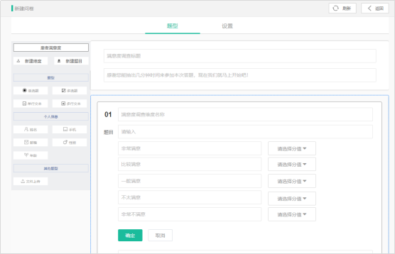 l 支持非满意度题目创建,此类题目如:姓名收集、性别收集、电话收集、性格爱好收集等,不计算分值,结果也不计入满意度调查数据分析中。