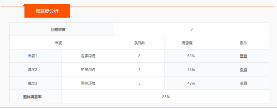 l 支持按照维度创建满意度,如:“医患沟通”、“护患沟通”、“患者需求响应”、“疼痛管理”、“用药沟通”、“出院说明”、“医院环境”、“医院整体评价”等。