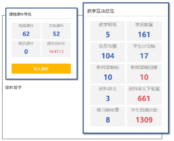通过在智慧学习平台大数据体系提供的数据报告,可以全方位的了解教师在线教学内容、行为以及成果,并和学生学习行为和结果相互印证,全面的了解教师的课程课件、课程讲义、教学互动、作业布置、在线考试等过程数据,同时进行横向和纵向比较。评估专家可以基于真实数据和个人经验对教师工作进行科学评估和真实反馈,实现“以评促建”,提高学校教学质量。