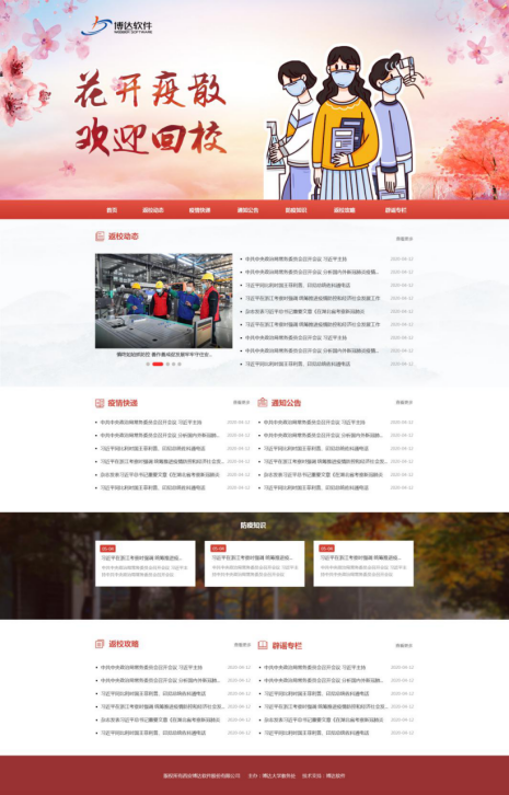 开学初期,防疫宣传工作也是重中之重,博达软件将原有疫情防控专题网站升级更新,为所有高校客户免费赠送开学疫情防控专题网站,模板包轻松部署,安全高效解决开学疫情防控宣传工作。现已成功为50余所高校免费部署,还未上线的客户可在文末登记领取~