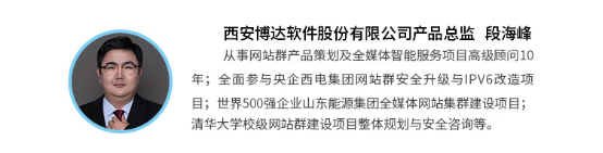随着等保2.0时代的到来,从多个维度论述了国企单位网站等级保护的重要性和必要性,结合国企网站发展现状,详细阐述了国企网站安全建设与综合治理之道—对网站系统自身进行安全改造,即集团统一网站群平台建设,加上外围的统一安全防护措施实现内外兼修的网站安全治理。并系统的讲述了博达网站群产品贯穿网站生命周期的安全防护体系,及内在的安全体系架构,博达软件为国企集团提供完整的网站群规划建设解决方案。演讲最后,段总还向与会嘉宾分享博达贴心服务模式,每一处细节都传达出博达服务至上的经营理念。