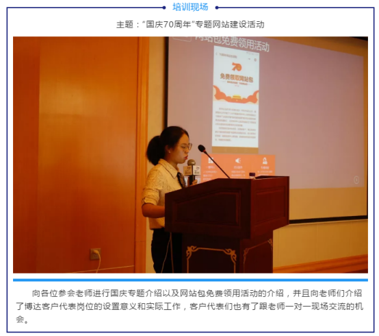 此次培训班开班仪式由博达软件副总经理王总表达对老师们一如既往支持的感谢。王总提到,博达软件于今年正式推出全新的全媒体产品,并在很多高校进行应用实践。博达软件定位为大型组织内容管理与智能服务提供商,博达的发展离不开各高校老师的长期支持,建设下一代网站群是博达的目标,为高校提供更安全、更智慧、更高效的服务是博达持续发展的动力。