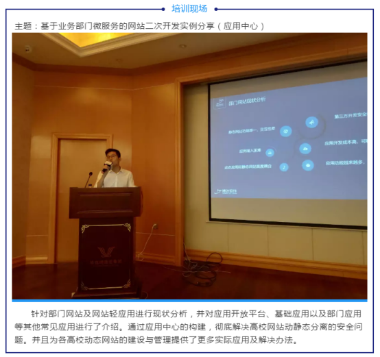 本次培训班主题为“智能·共享·变革”,有来自全国60余所高校的网络信息中心相关信息化、网络管理人员,院部网站管理人员以及宣传部老师参加,针对全媒体网站群的全新构建,全媒体建设、全媒体信息发布、全媒体管理体系、全媒体融合能力等内容进行专项研讨和培训。深入学习贯彻落实全国网络安全和信息化工作会议的重要讲话精神,落实《教育信息化“十三五”规划》和《教育信息化 2.0 行动计划》,同时,进一步落实工业和信息化部于2019年4月发布的《关于开展2019年IPv6网络就绪专项行动的通知》和2019年12月1日正式实施的等保2.0要求,进而推进高校教育信息化的创新和发展。