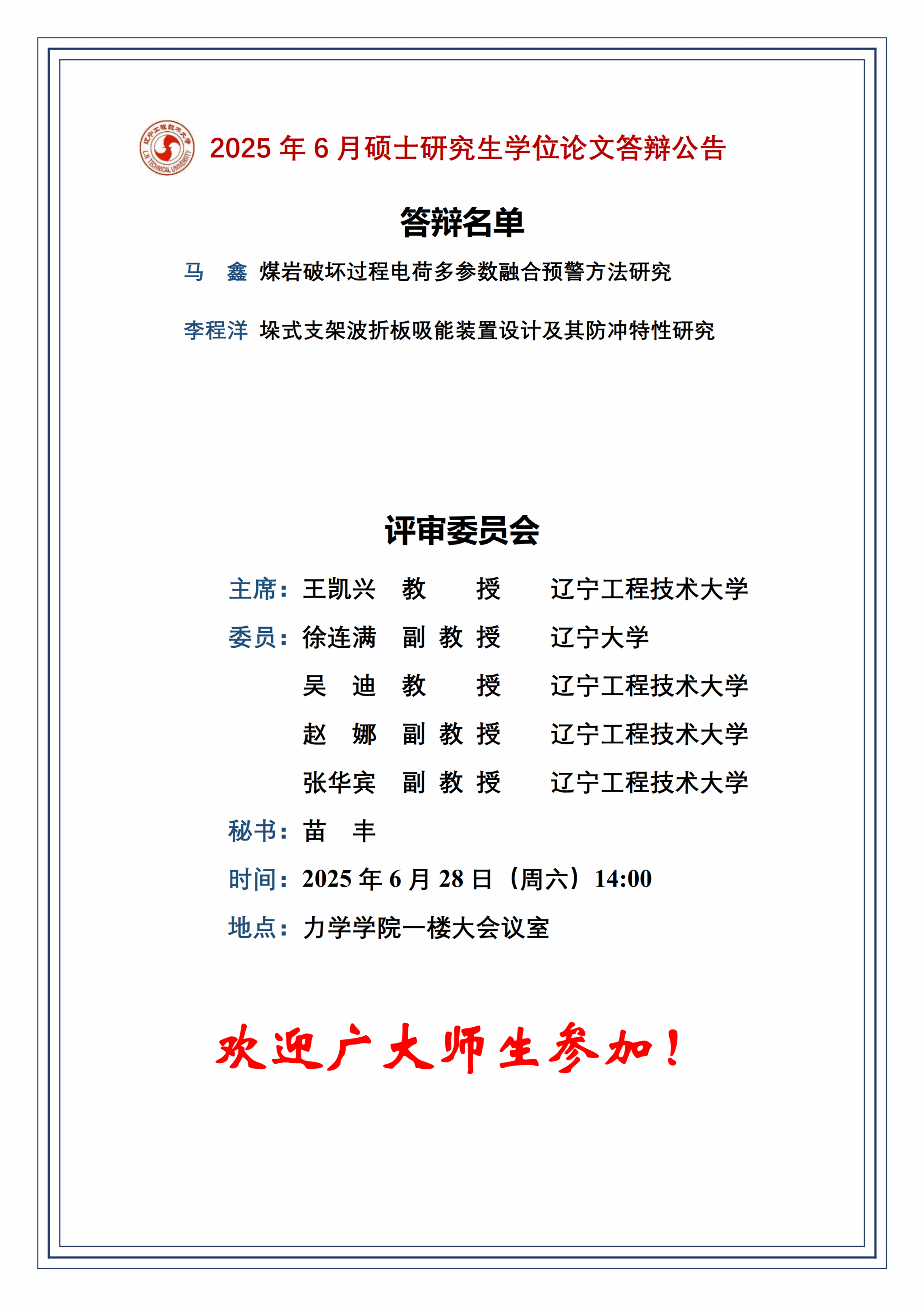 2025年春夏学期硕士学位论文答辩公告(灾害力学三组)