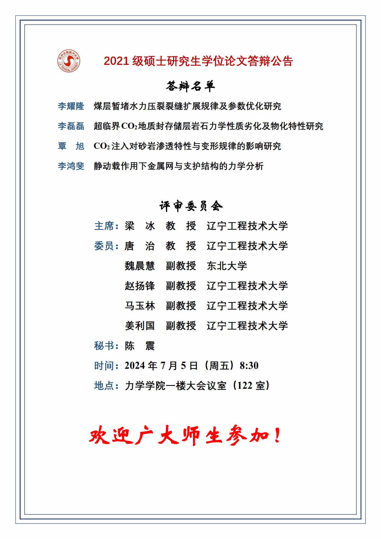2024年春夏学期硕士学位论文答辩公告