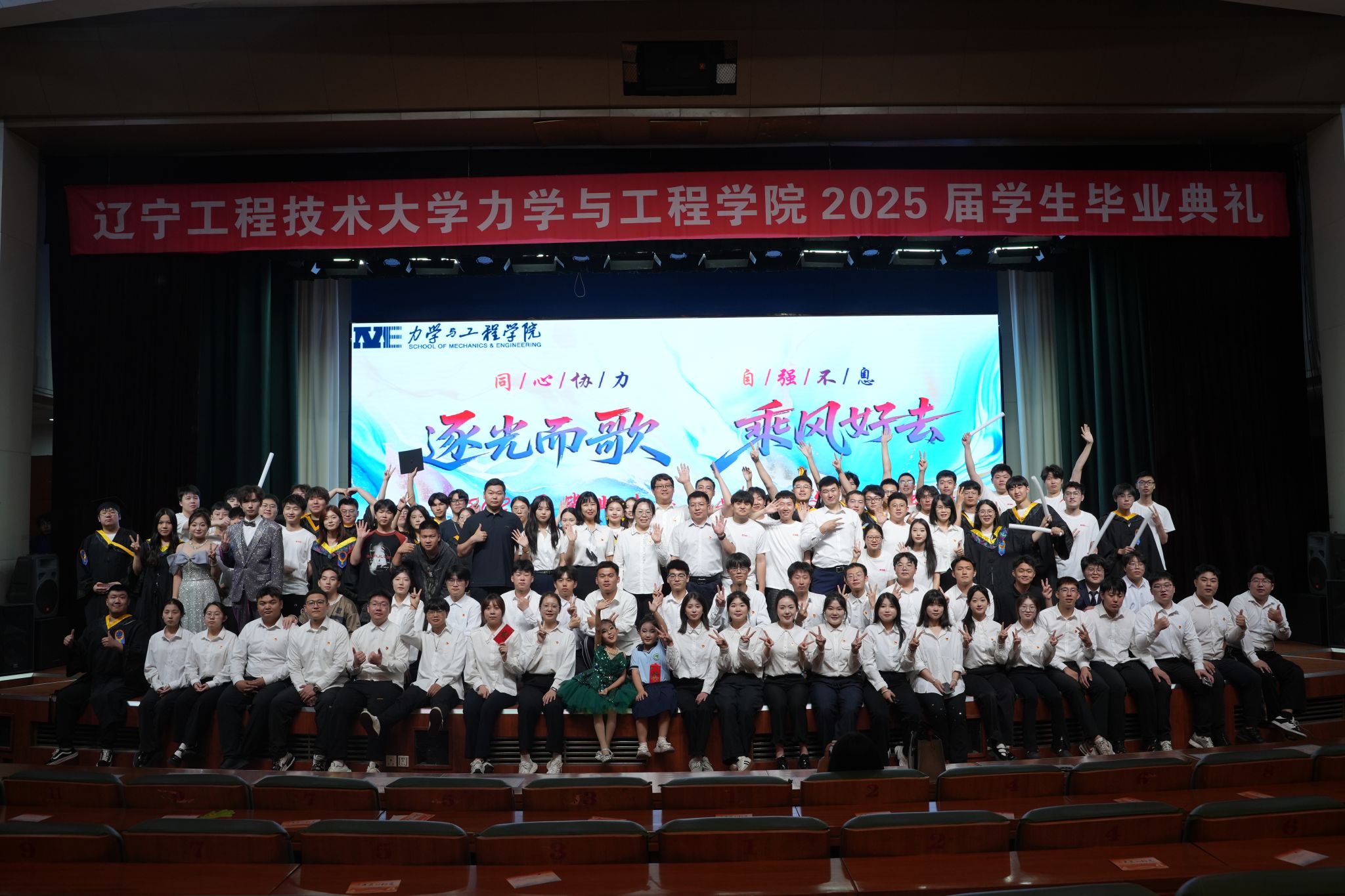 毕业典礼结束后,“逐光而歌 乘风好去”文艺演出拉开帷幕,在嘹亮而又熟悉的校歌旋律中,2025届毕业生毕业典礼暨文艺演出圆满落下帷幕。本次活动不仅是青春骊歌的唱响,更是力学薪火赓续相传的崭新篇章。愿毕业生们从母校启航,带着“力学”的坚韧与智慧,以奋斗之姿报效家国,在更广阔的天地间,书写更壮丽的篇章。