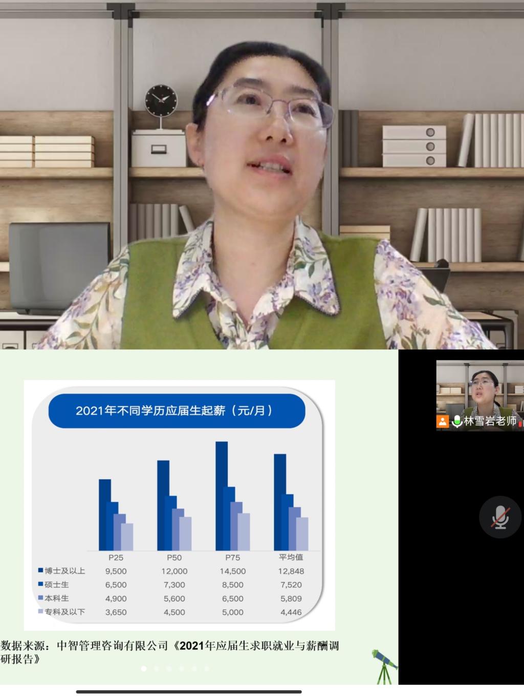 林雪岩老师以就业的意义为切入点,通过对目前未就业学生、考研二战学生的原因分析,对慢就业、缓就业的既有问题进行了剖析和评价,对目前还未就业的学生进行了及时的关注和提醒,并针对此类问题给出了一些可供参考的建议。同时,根据自身的工作经历,为同学们进行了未来职业发展、收入变化以及社会认可度等方面的经验分享。学院学工部主任王瑞斌对同学们提出了希望和要求,呼吁未就业的学生们拒绝怠惰、拒绝躺平,担起责任、直面未来,用实际行动完成“自己当年立下的flag”。