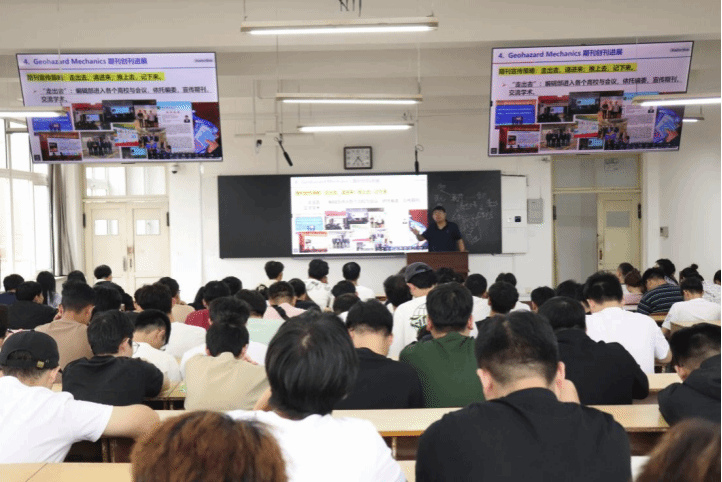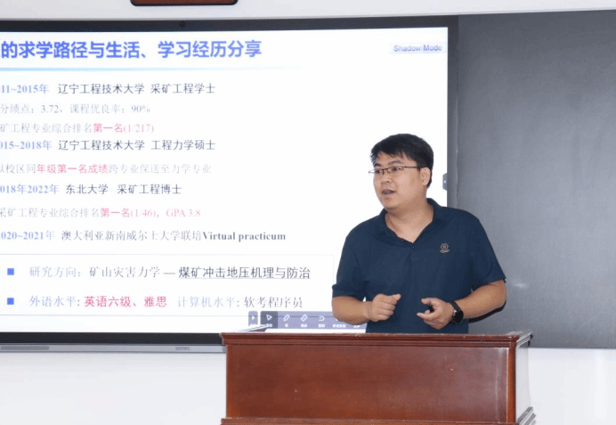 代连朋老师做了以《煤矿动力灾害学术交流与个人求学经历分享》为题的讲座。分为四个章节进行讲述,分别是:1.个人的求学路径与生活、学习经历分享;2.对力学专业科研技巧与实现方法的感悟;3.硕士期间科研方向选择与科研成果积累;4.Geohazard Mechanics期刊创刊进展。在讲座中,他回顾了自己的求学经历、科研历程、研究方法等,详细讲述了他在力学领域不断取得成绩的成长经历和未来发展的方向。强调了终身学习的必要性与重要性,鼓励同学们积极面对挑战,勇于创新。并现场与学生们进行了交流互动,耐心解答同学们关于职业规划、行业趋势等方面的问题。代连朋老师的演讲风趣幽默,赢得了在场同学的阵阵掌声,现场气氛温馨而热烈。