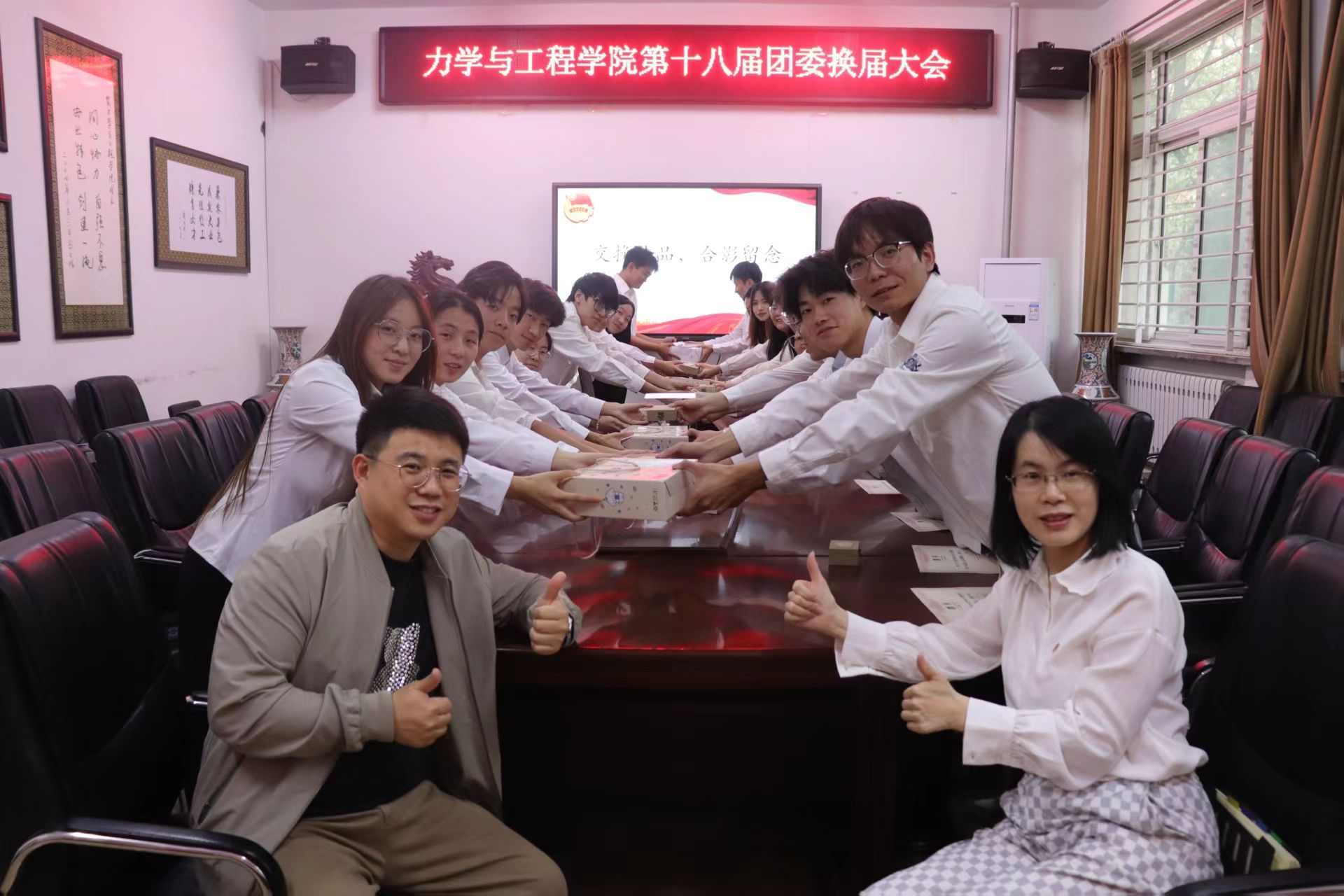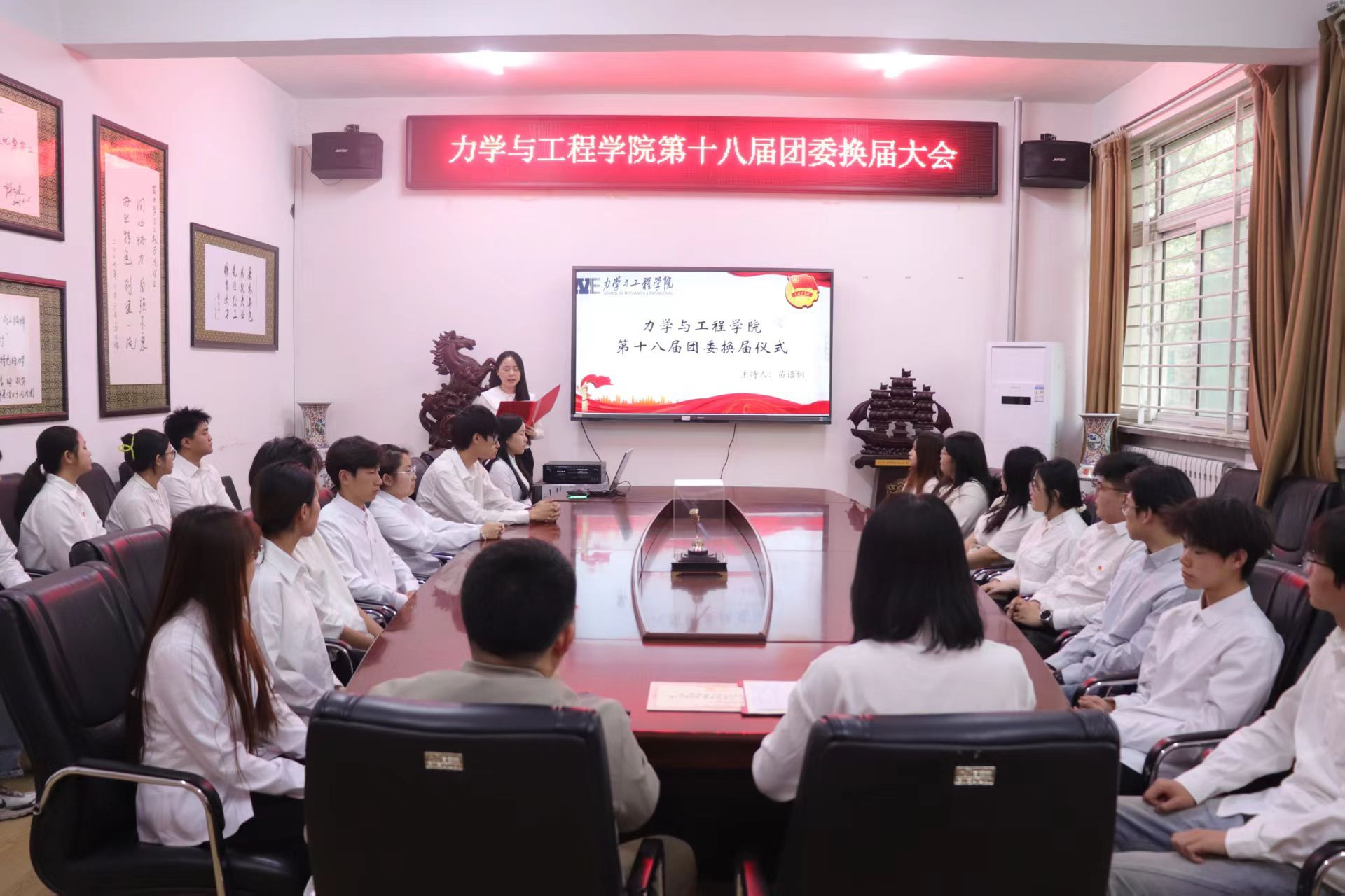 新一届团委成员名单在会上揭晓,两届学生干部郑重完成交接仪式,两位老师为第十七届团委学生骨干逐一颁发聘书。第十七届团委主要学生干部依次送上寄语,向新一届团委成员致以热烈祝贺,并为学院共青团事业送上美好祝福。交接仪式上,学长学姐将承载责任与期望的接力棒郑重传递,叮嘱新一届学生干部保持谦逊务实作风,传承“同心协力,自强不息”的院训精神。他们期待新一届成员勇担使命、锐意创新,充分展现力学学子昂扬向上的青春风貌,以实干担当推动学院学生工作再上新台阶。