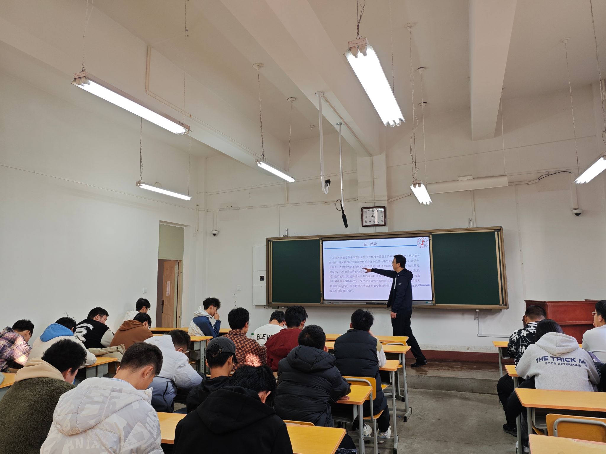 王老师为同学们讲解了块系岩体研究的最新进展,并深入解释了块系岩体在静载条件下的特征,深部岩体工程响应的静力特征表现为非协调变形的现象,并详细阐述了这一现象的产生机理。王老师还介绍了块系岩体波动传播特征,摆型波是深部块系岩体动力传播的一种特殊现象,这种波动以较大的幅值、低频、低速在岩体中传播,极易诱发冲击地压等动力灾害。