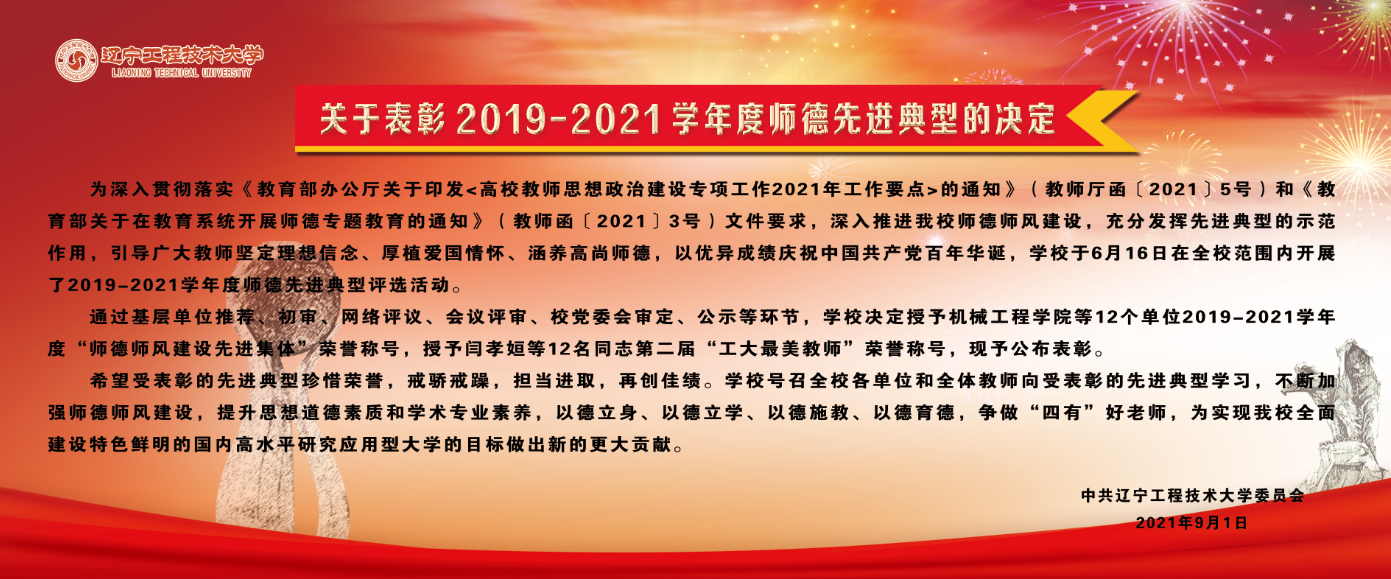 成人直播 工程力学系荣获2019-2021学年度“师德师风建设先进集体”荣誉称号、王俊光荣获第二届“工大最美教师”荣誉称号